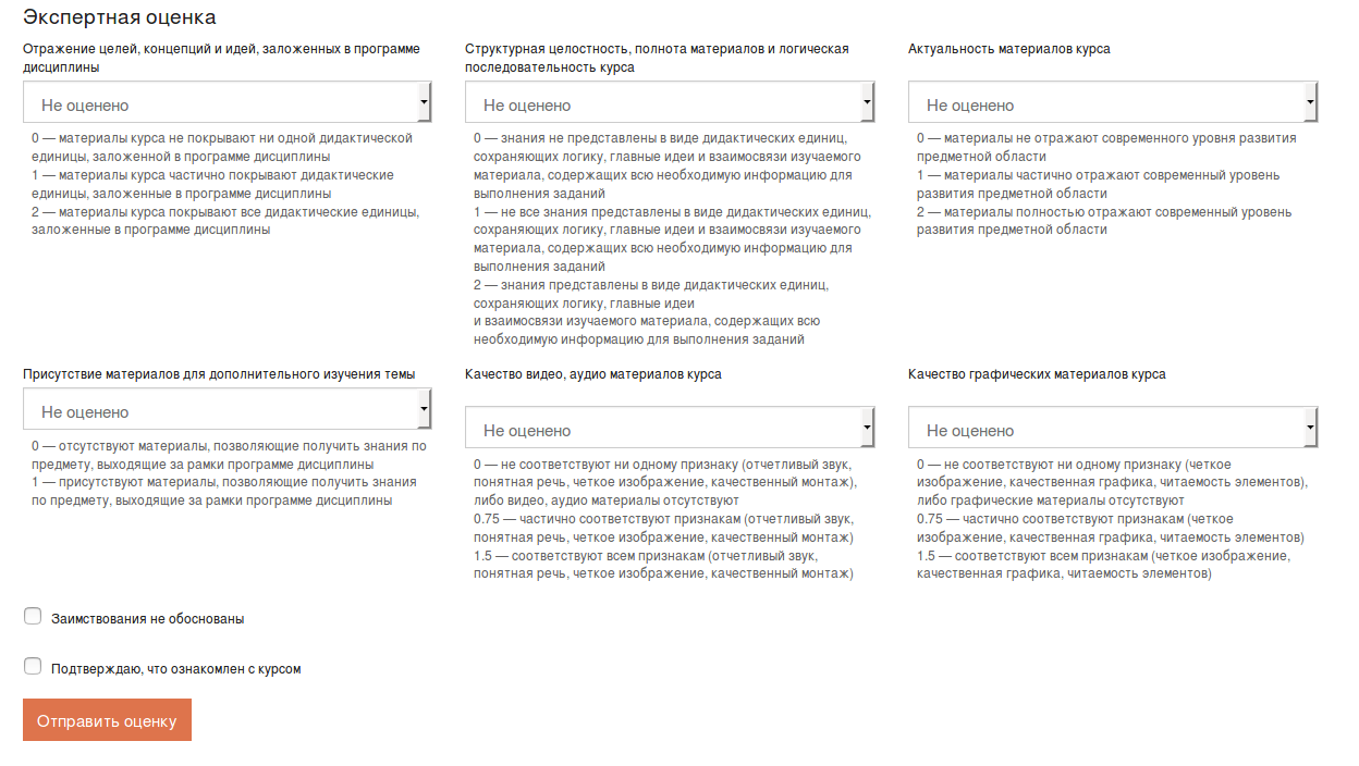 Далее расположена форма оценки курса. Для каждого критерия указана расшифровка возможных оценок. После выставления оценок нажмите кнопку «Отправить оценку».